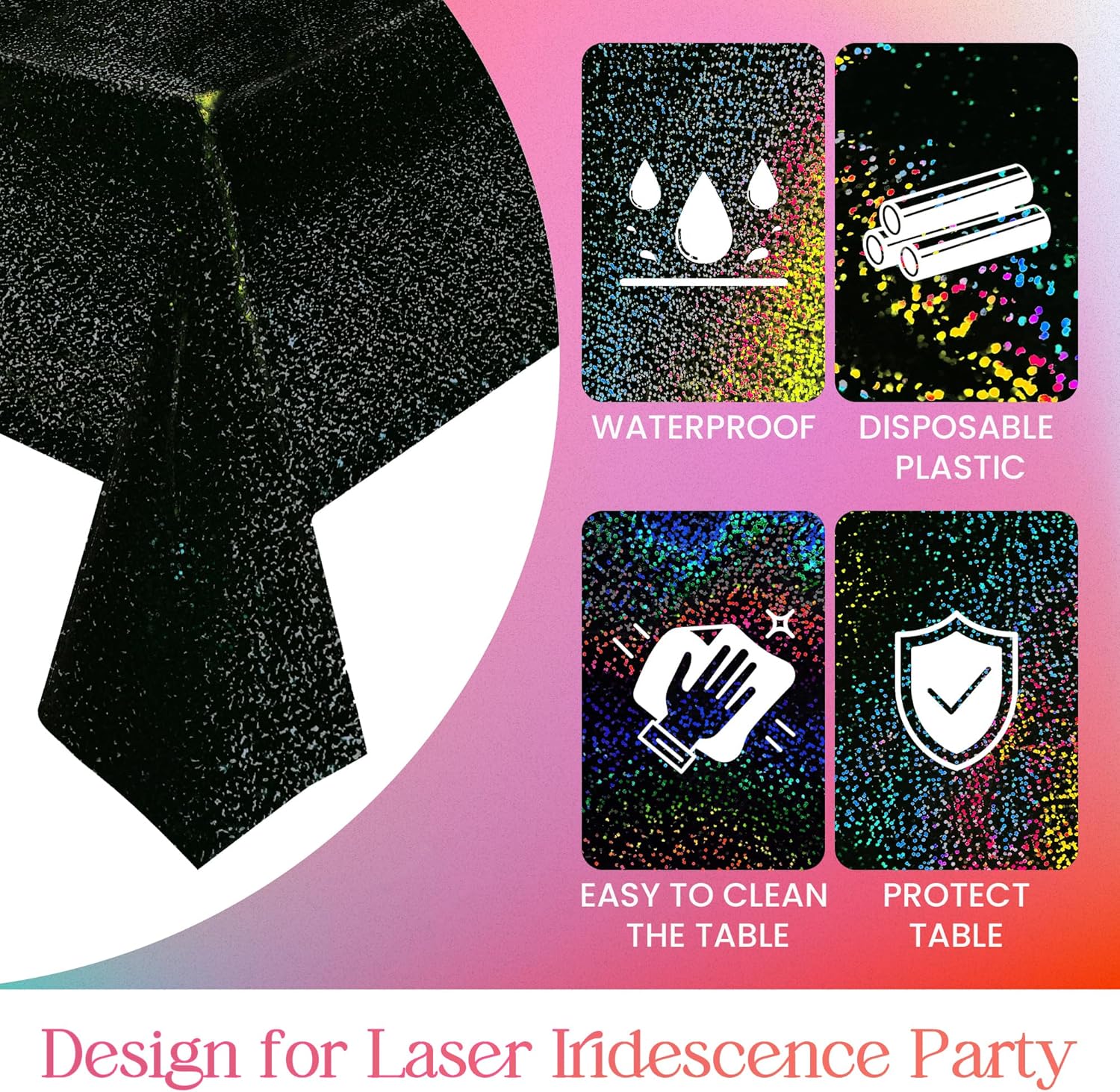 1 Pcs Black Holographic Laser Tablecloth Galaxy Space Table Cloth 40 * 108 Inch Shimmer Star TableCover for Halloween Birthday Graduation Neon Party Supplies Disposable Plastic Foil Table Decor