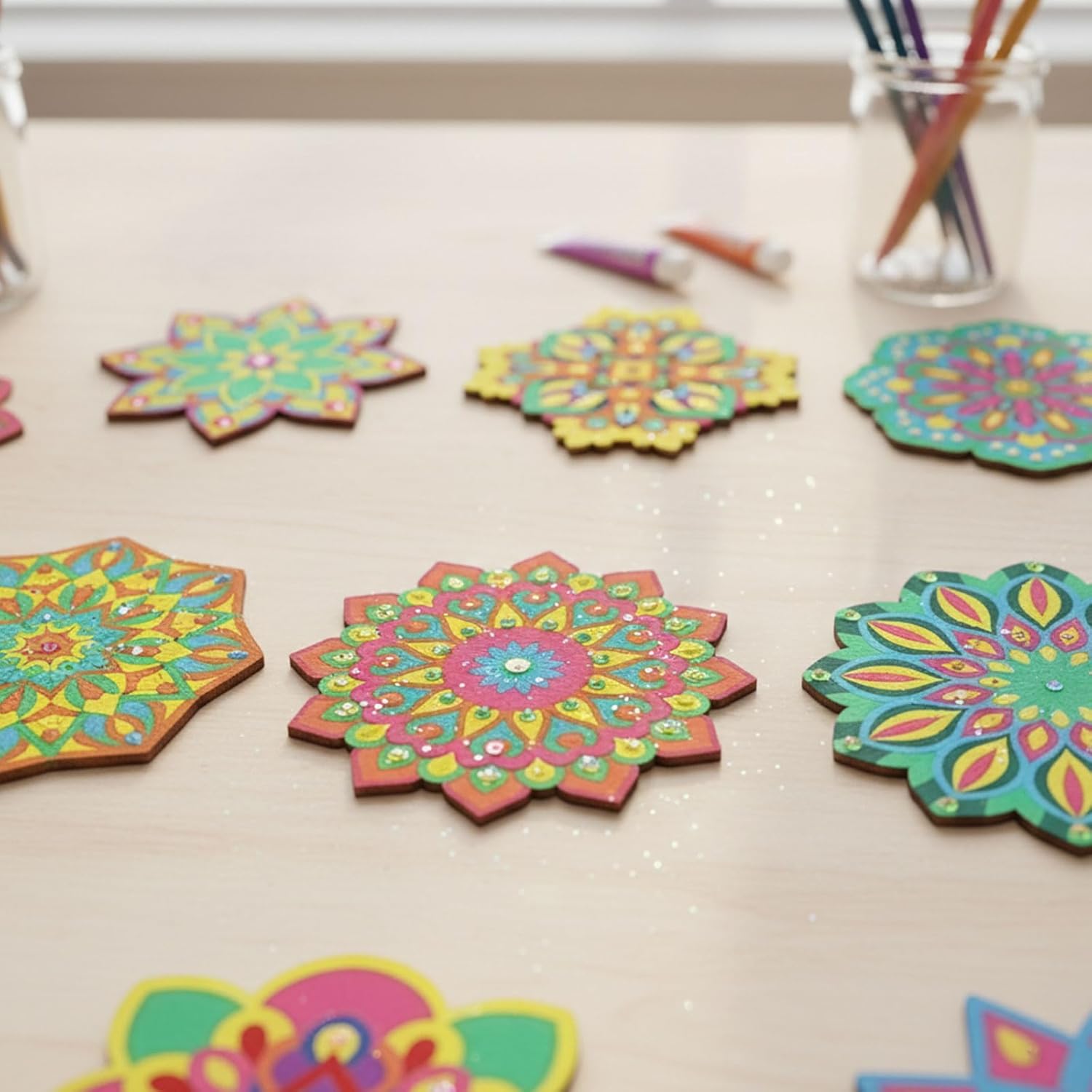 Material Quality and Specifications:These premium rangoli stencils are crafted from 7.8×7.8 inch unfinished wood slices. The rangoli mat surface provides smooth painting experience. Perfect rangoli kit base for various artistic projects and DIY creations