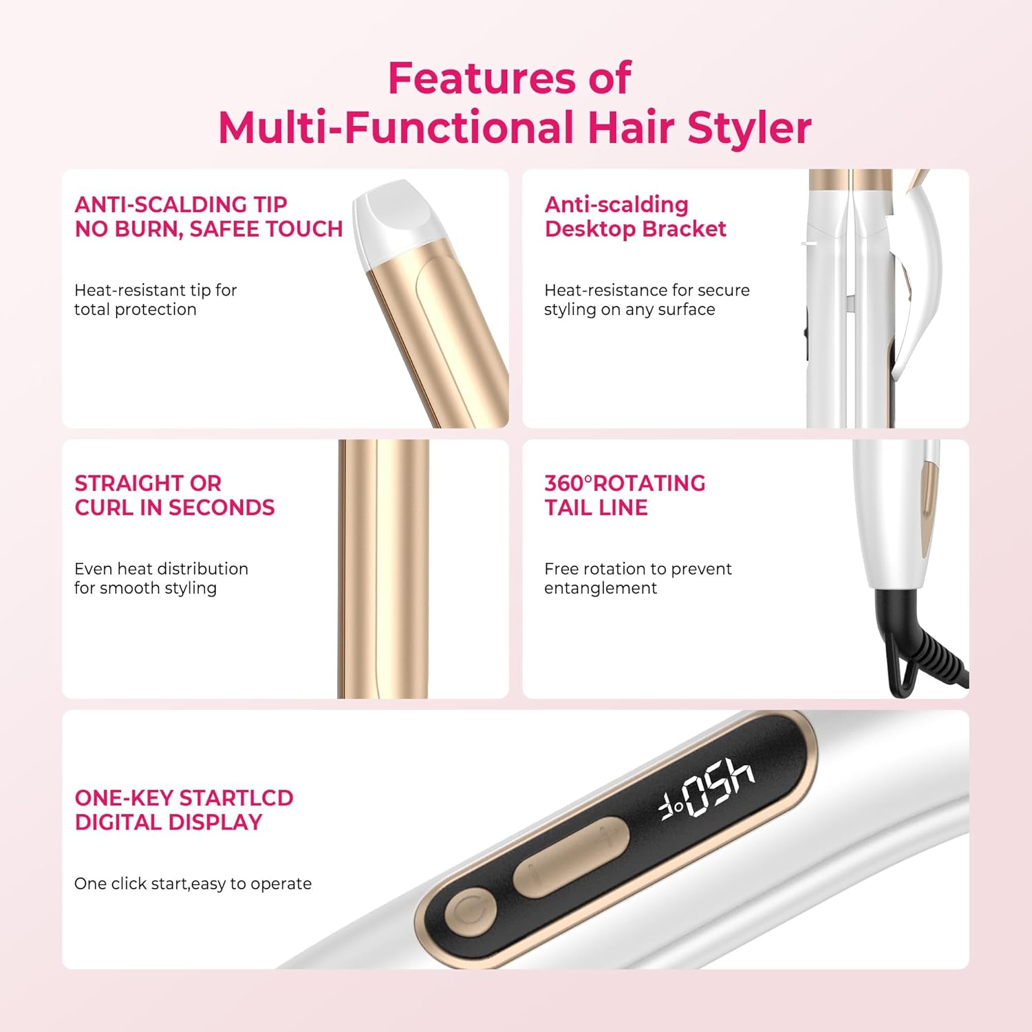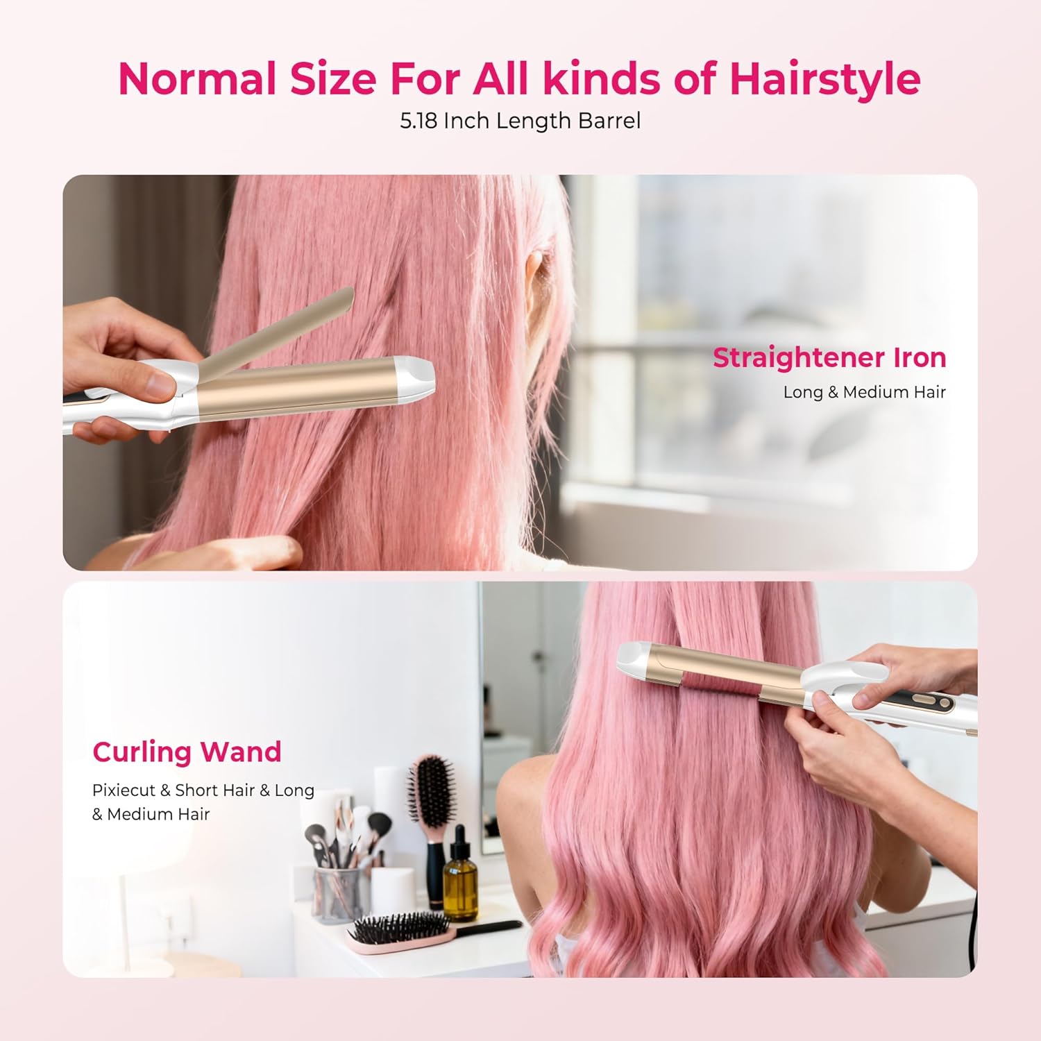 2-in-1 Styling for On-the-Go Needs: This versatile 2-in-1 hair tool combines a 1.25-inch ceramic barrel for both curling and straightening, letting you create sleek or wavy hairstyles effortlessly. Its compact design makes it a perfect travel companion, ideal for styling anytime, anywhere