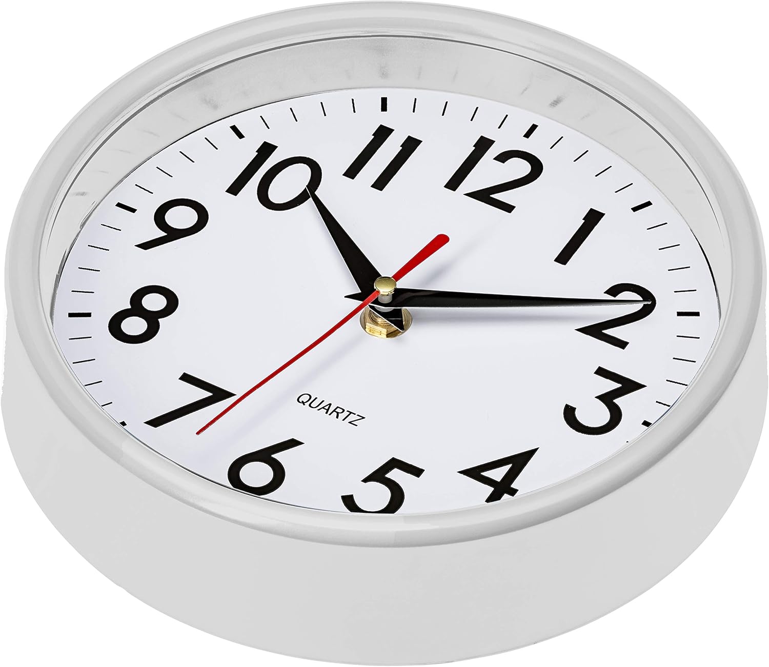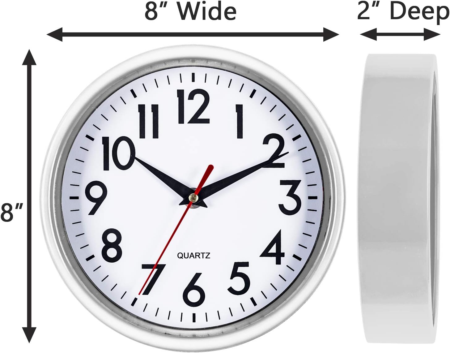 8 inch white wall clock. Decorate and enhance your bedroom, classroom, kitchen, bathroom, kids room, baby nursery, gym, bedroom, school or office with this classic wall clock. Works with any decor!