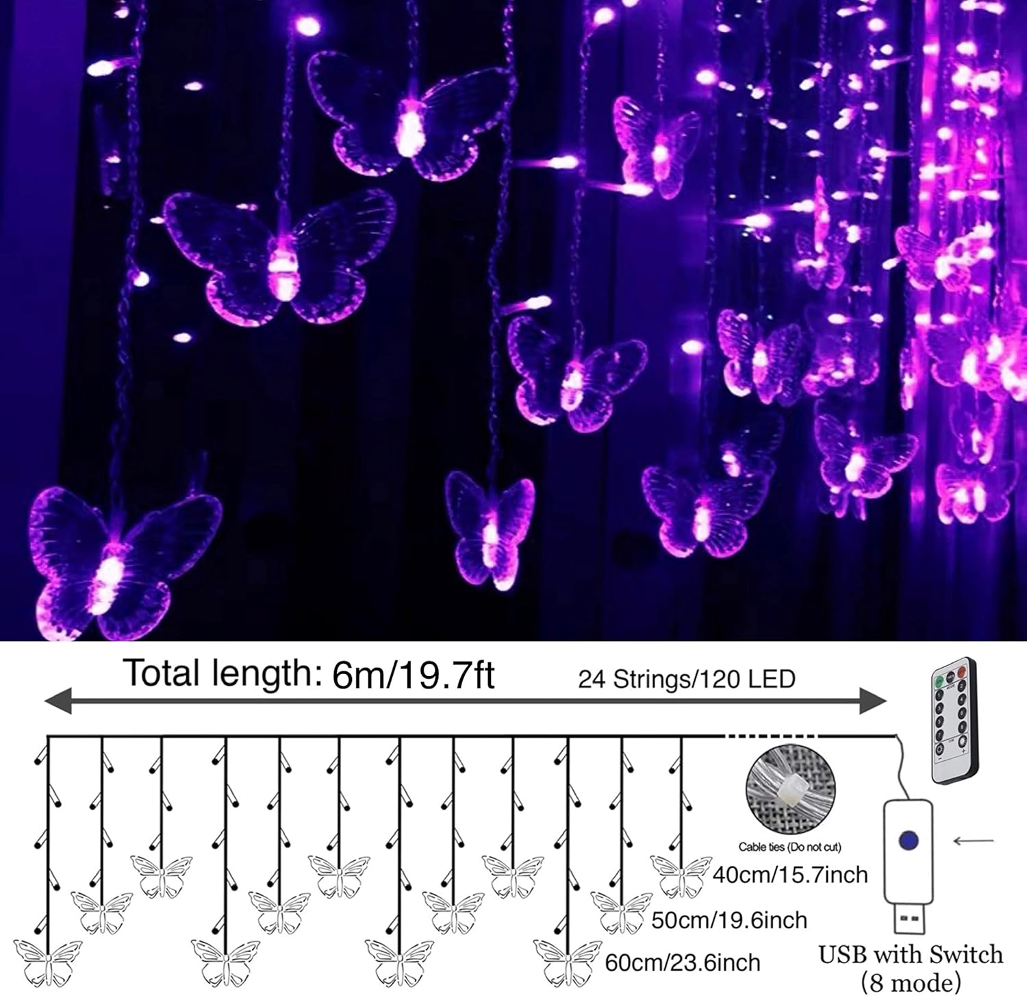 Color: purpleLED Qty: 120pcs(including 24 butterfly lights)Total length : 6m/19.7ftLight line length : 4 mUSB plug cable :2mString drooping length : 40/50/60 cmPower source: USB Plug in by mobile power bank