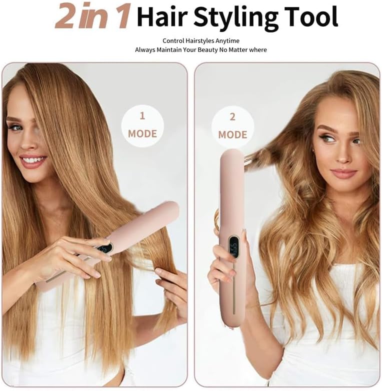 Cordless Hair Straightener and Curler 2 in 1 Portable Flat Iron Wireless Hair Straightener for Travel, USB-C Rechargeable 4800 mAh Battery Fast Heating Pink