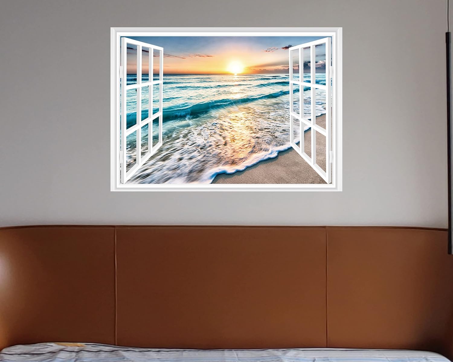 FLFK Fake Window Wall Sticker – Sunset Beach Faux Window Wall Mural for Wall Decor, Stick and Peel Wall Decals,48″x32″,Set of 2 Sheets