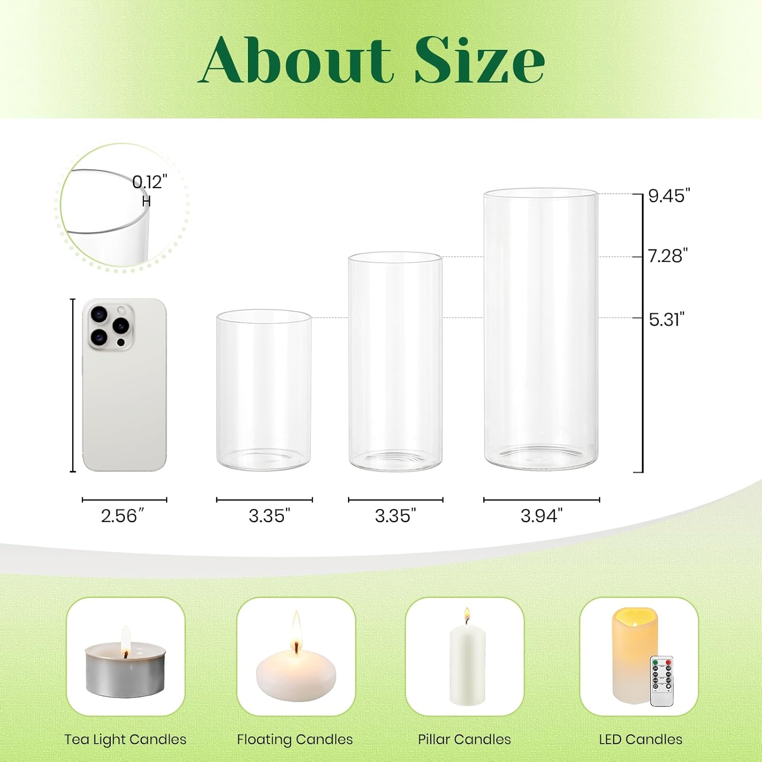Upgraded 0.12inch Thickness: The thickness of this cylinder vase set has been improved from 0.08in to 0.12in, cutting the breakage rate by 47% for long-lasting use. This reinforced thickness ensures strong stability to perfectly fit flower arrangements, pillar candles and floating candles without tipping over.