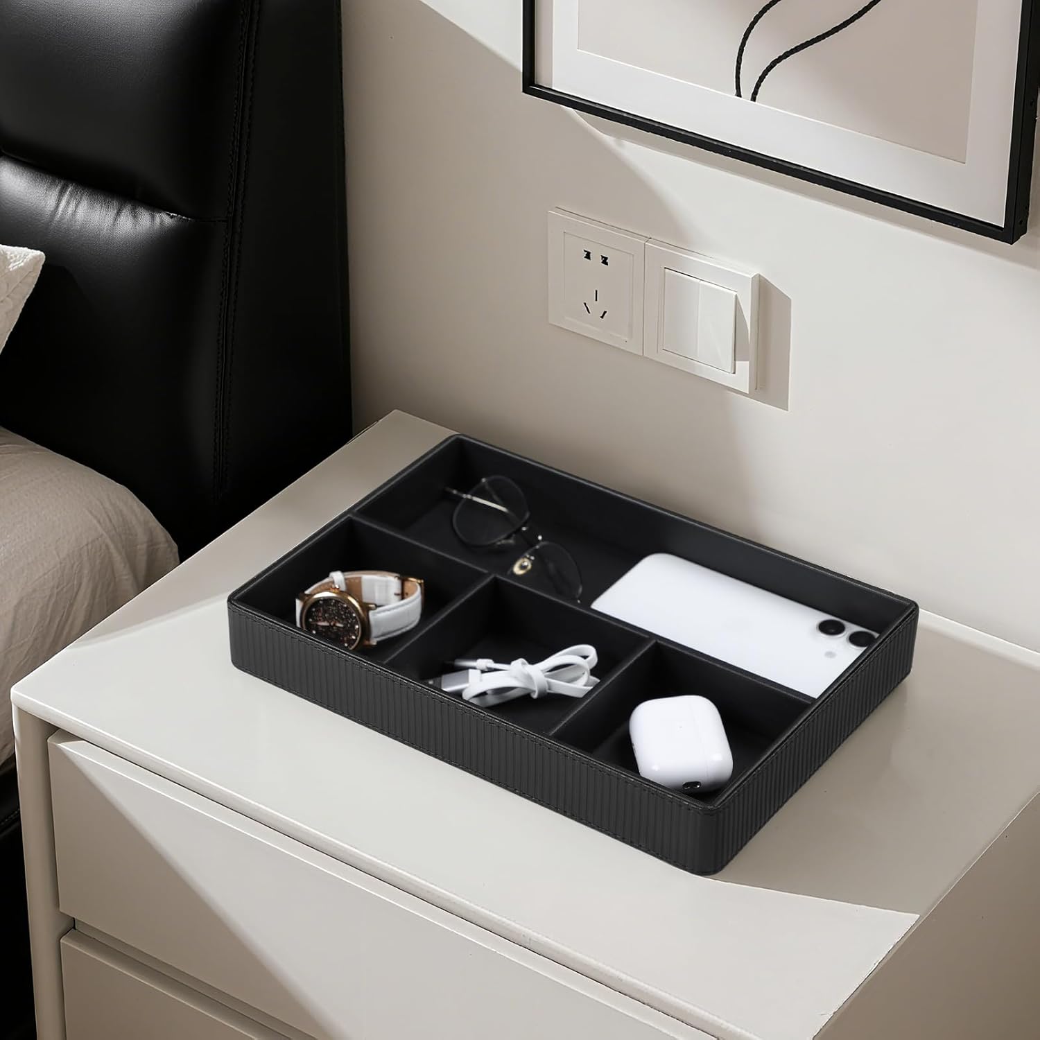 4-Compartment Nightstand Tray – The different sized compartments fit different items and in place