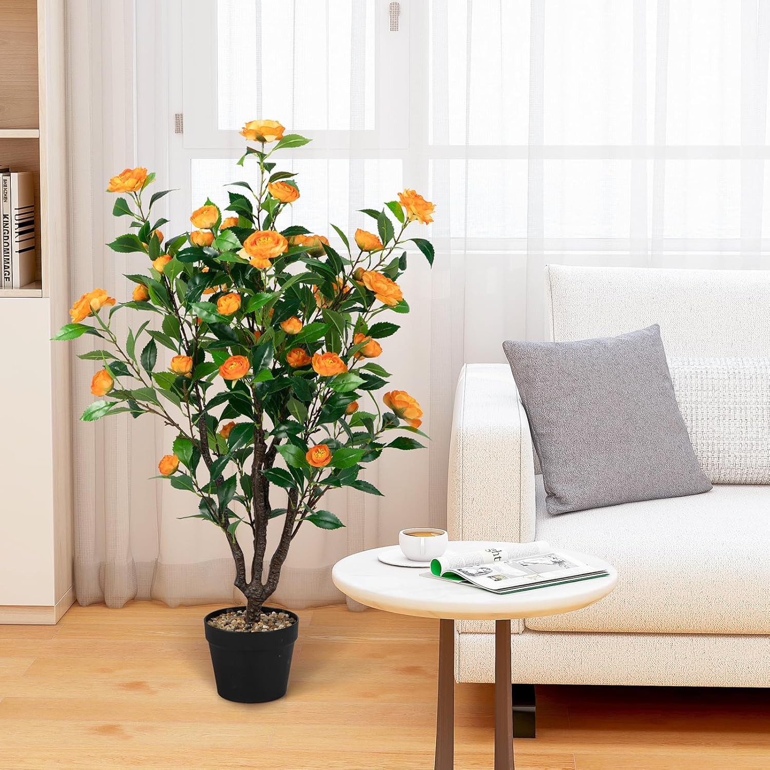 Stable Structure & No Installation Required: The faux camellia potted tree is supported by a solid pot with built-in cement and strong PP trunks, and you just spread branches and leaves outward to get a fluffy shape.