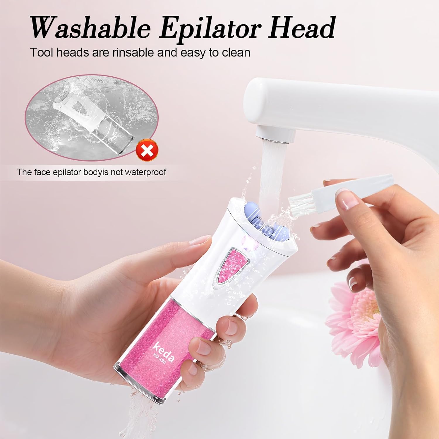 🦵【Easy To Use And Easy To Clean】This facial epilator has a simple design with a one-touch button design to make epilation more convenient. The washable head can be rinsed under running water and with the included brush for a more thorough cleaning, ensuring hygiene and convenience.(Note: The body is not waterproof)