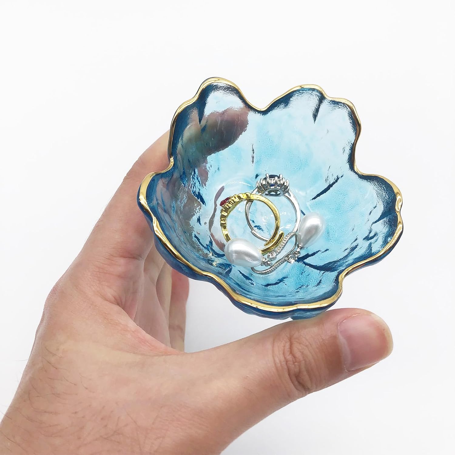 Versatile Use : Glass jewlery dish is perfect for holding rings, earrings, necklaces, lipsticks, coins, beads and other small trinkets, keeping your jewelry organized and easily accessible. Ring dish holder is also suitable for holding keys in the hall next to the front door or holding soaps by the sink. Small jewelry tray is great for storage rings, necklaces and other jewelry on your nightstand, dresser table, bedside table, bedroom, bathroom, kitchen or sink.