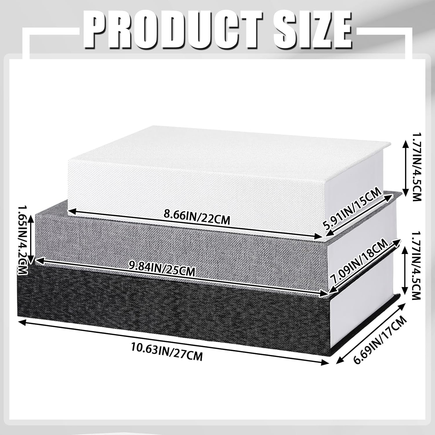 Suitable Size: this faux book storage box has 3 sizes, respectively measuring approx. 10.63 x 6.69 x 1.57 inches/ 27 x 17 x 4 cm, 9.84 x 7.28 x 1.5 inches/ 25 x 18.5 x 3.8 cm and 8.66 x 5.91 x 1.77 inches/ 22 x 15 x 4.5 cm, which is suitable for decorating your bookshelf, desk and other places without taking up too much space