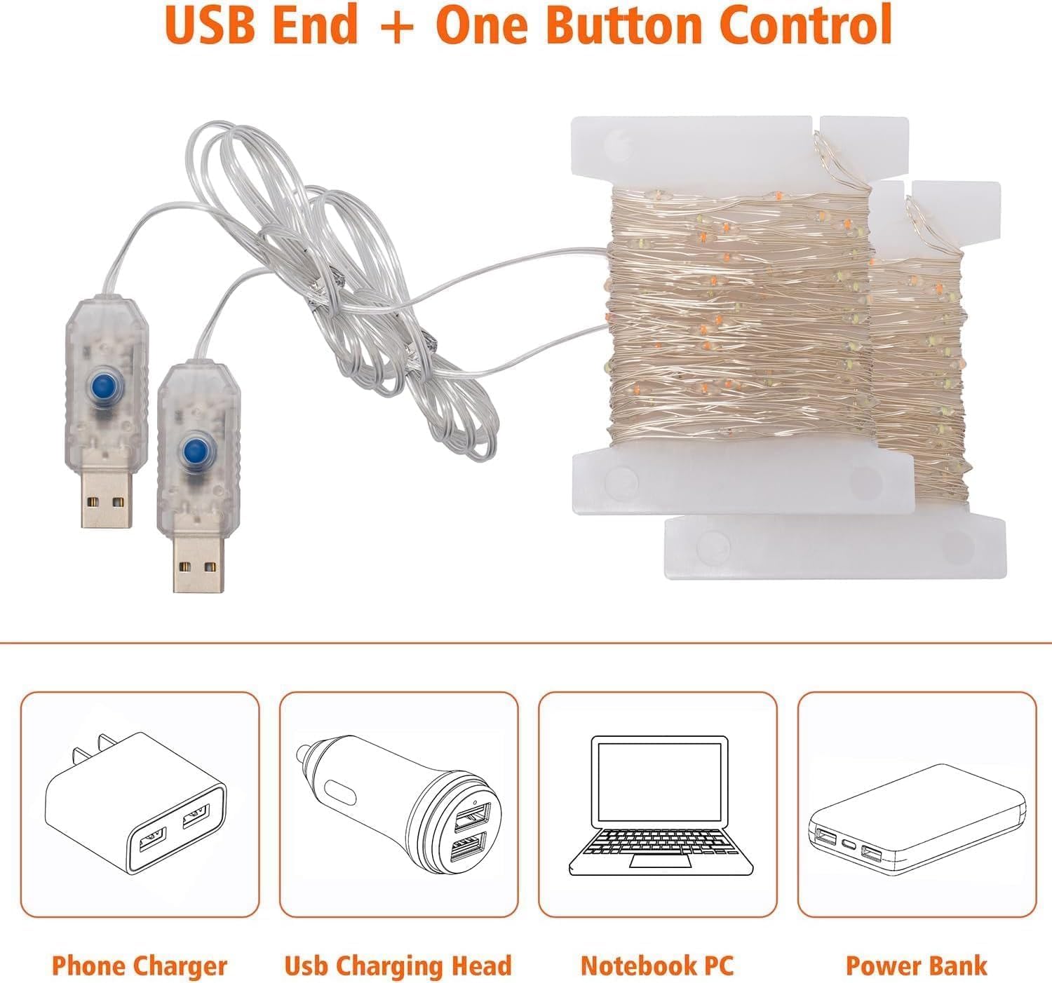 2 Pack Fairy Lights: Each 33ft (100 LED mini bulbs), 39-inch USB lead cord, 4-inch bulb spacing. Total 66ft, perfect for home decor.