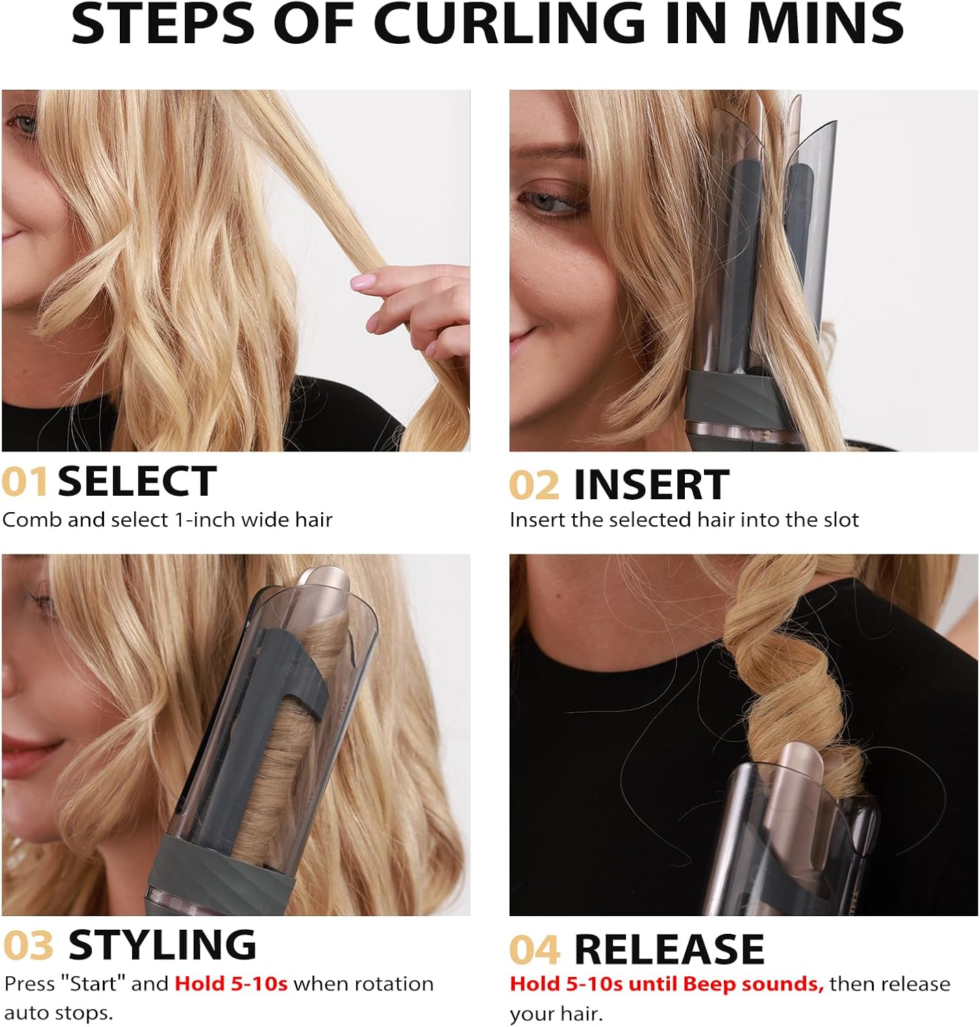 [Easy Steps for Automatic Curling] 1.Long press power button for 2s to turn on; 2.Choose temp, style & direction; 3.Long press “Start” to curling your hair; 4. Hold 5-10s until you heard beep sound, then release your hair.