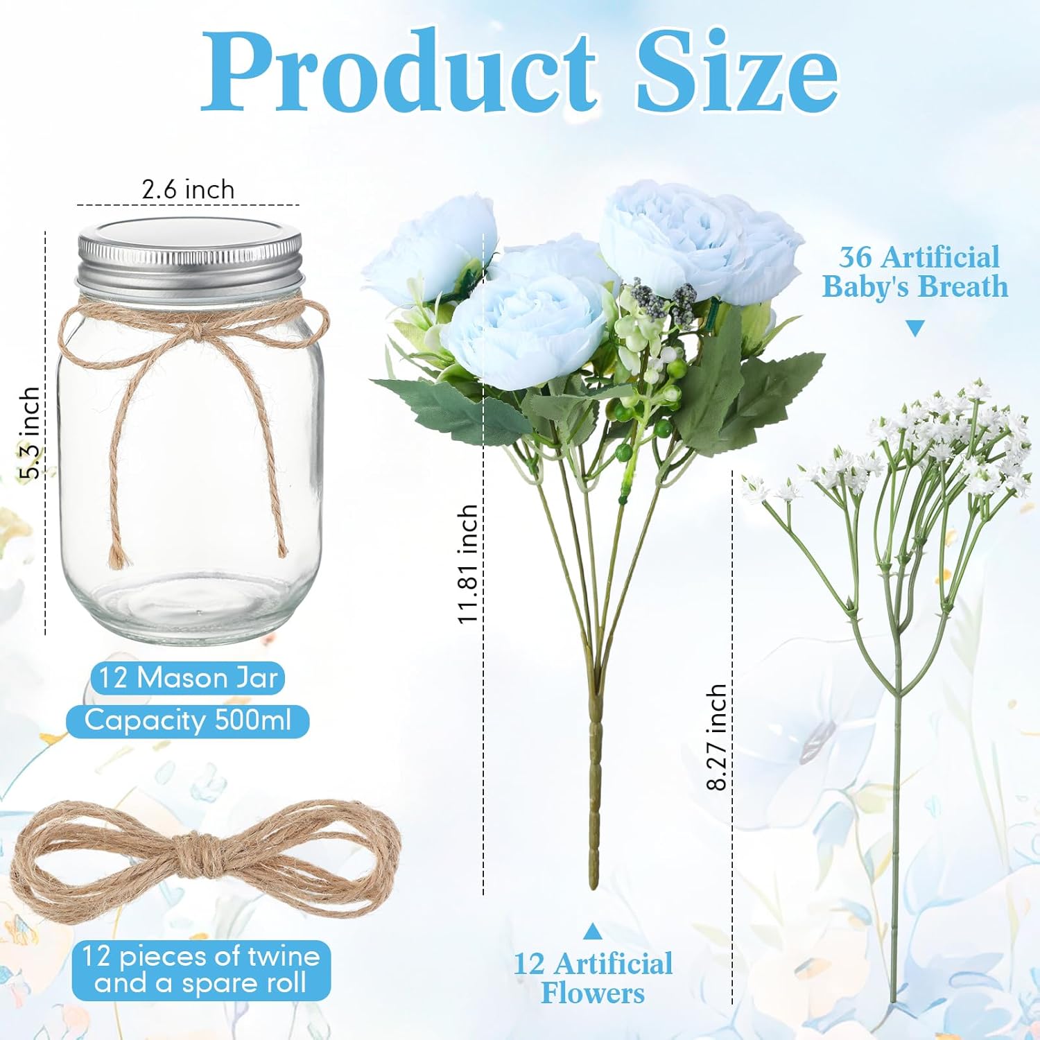 Complete Decor Set: includes 12 mason jar vases with lids and twine, 12 artificial peony bouquets, and 36 Artificial Baby’s Breath Sprigs; This comprehensive package provides everything needed for instant, elegant floral arrangements